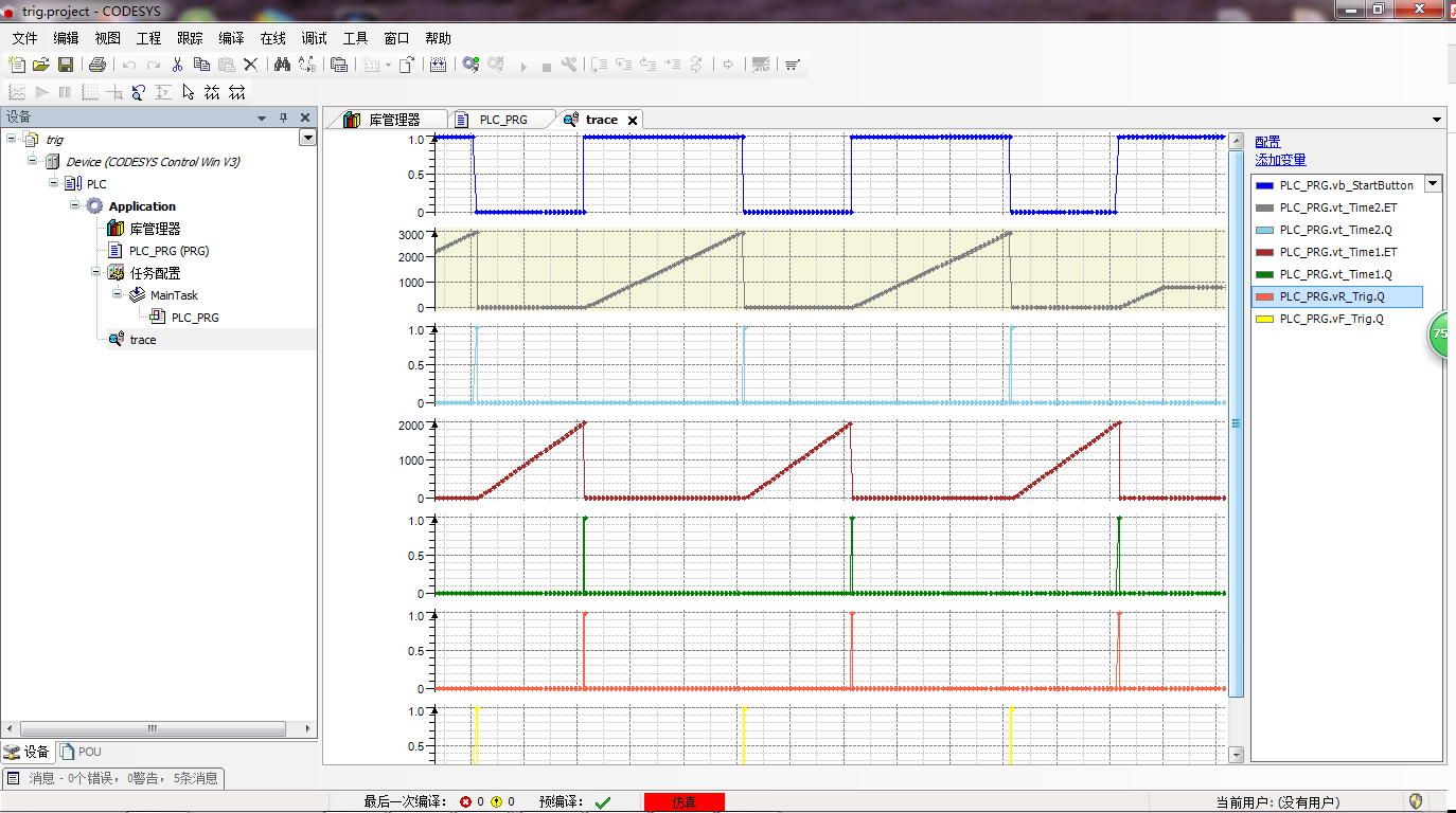 vb_启动按钮 S= hb_启动信号; “vb_启动按钮”是程序中用到的局部变量,“hb_启动信号”是触摸屏上的启动信号。当“hb_启动信号”在一个扫描周期内为true的时候,“vb_启动按钮”这个局部变量按钮就会被置位为true。