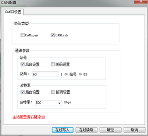 H3U-1616MT-XP机型是支持canlink通信的,canlink协议的配置点击通信配置中的CAN配置,弹出can口设置对话框,这里协议类型我们选择汇川技术自己的canlink,站号勾选成后台设置类型,主站站号我们设置为63号.波特率也选择后台设置,我们一般不使用拨码设置.这里波特率需要和伺服中功能码H0C-08设置成相同的波特率.
