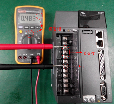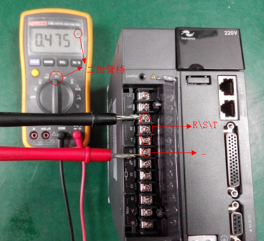 b、使用万用表的二极管档位,红表笔点”-“,黑表笔分别点三相输入端子(R、S、T),测量整流部分三相下桥是否正常,万用表显示在0.4V左右为正常,短路或开路说明损坏,如图2所示。