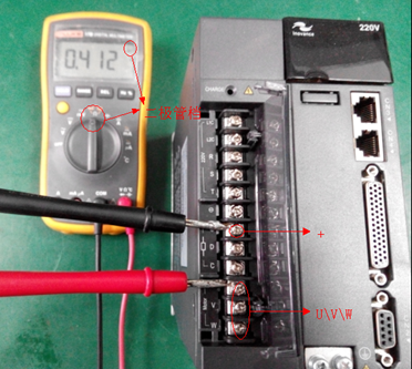 b、使用万用表的二极管档位,红表笔”-“,黑表笔分别点三相输入端子(U、V、W),测量整流部分三相下桥是否正常,万用表显示在0.4V左右为正常,短路或开路说明损坏,如图4所示。