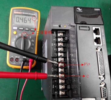 a、使用万用表的二极管档位,红表笔点C,黑表笔点P(+),测量制动管的续流二极管是否良好,万用表显示在0.4V左右为正常,短路或开路说明损坏,如图5所示。