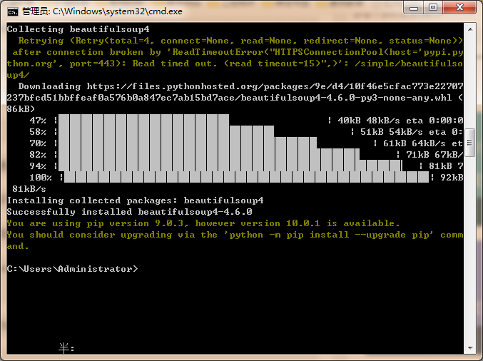 确定pip3安装成功后,我们接下来进行安装BeautifulSoup4,在dos框下输入pip3 install beautifulsoup4,回车等待。然后出现如下信息,即表示安装成功。