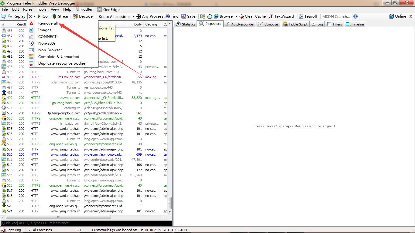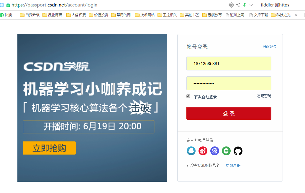 这两步完成,基本上既可以抓https的数据包了。下面开始,关闭浏览器所有页面,只打开csdn登陆页面,然后清除fiddler所有连接信息,清除所有,便于登陆的时候抓包。