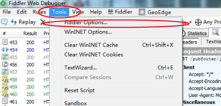 这里首先说明,csdn网站链接使用的是https协议,使用fiddler软件抓https的时候,需要配置一下才能开始抓https的数据包。首先选择tools,然后点击option,进行配置。