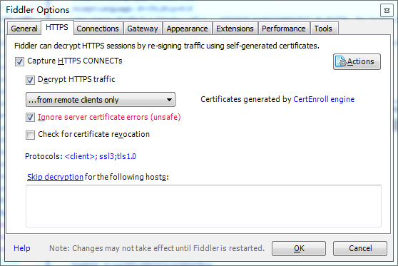 打开HTTPS配置项,勾选“CaptureHTTPS CONNECTs”,同时勾选“Decrypt HTTPS traffic”,弹出的对话框选择是(这里是按照fiddler自己的证书)如果跟我一样手机跟电脑是用wifi进行链接的话还需要选择“…fromremote clients only”。如果需要监听不可信的证书的HTTPS请求的话,需要勾选“Ignore servercertificate errors”。