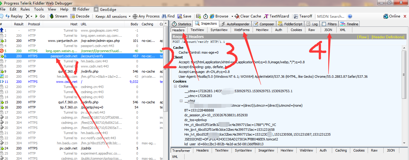 清除完信息后,在CSDN登陆页面,输入账号和密码进行登陆设置操作,抓包开始。登陆成功后,打开fiddler页面,找到passport.csdn.net域名,然后点击,在右侧即可看到相关的数据包。